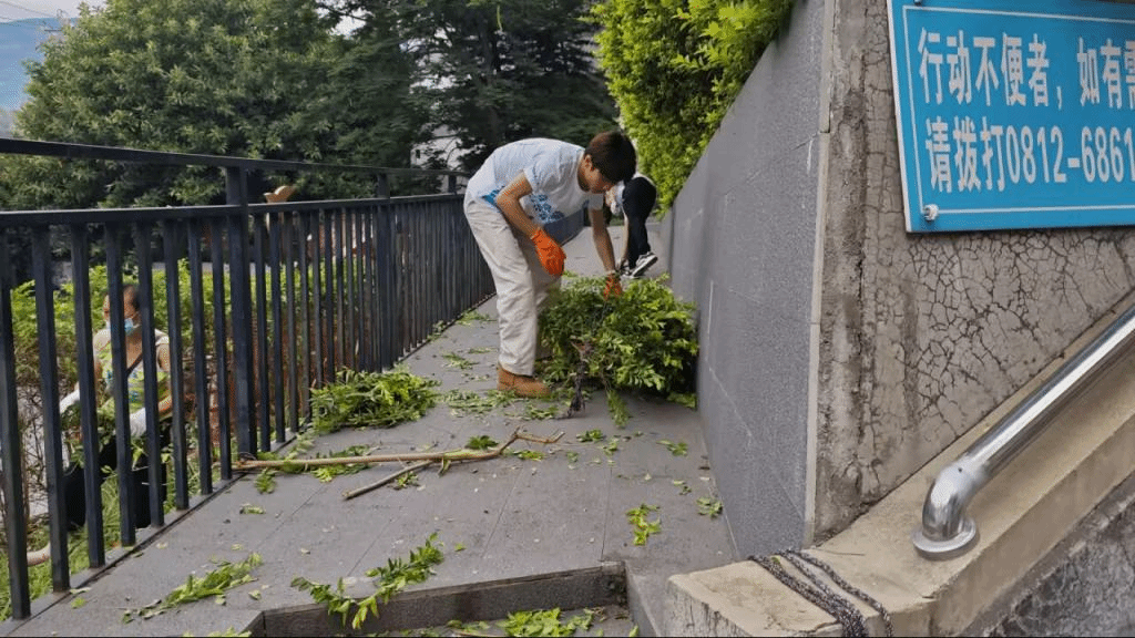 7月3日,实践团队奔赴兰尖社区,开启三线精神寻根之旅。团队成员拿着扫帚、修枝剪等工具,投身社区环境整治。清扫街道白色垃圾、修剪博物馆周边树枝,汗水湿透衣衫。劳动间隙,队员们被路边民居外墙吸引,斑驳墙面上挂着铁锹、煤油灯、旧算盘,搪瓷缸印着“为人民服务”,扁担磨得发亮。